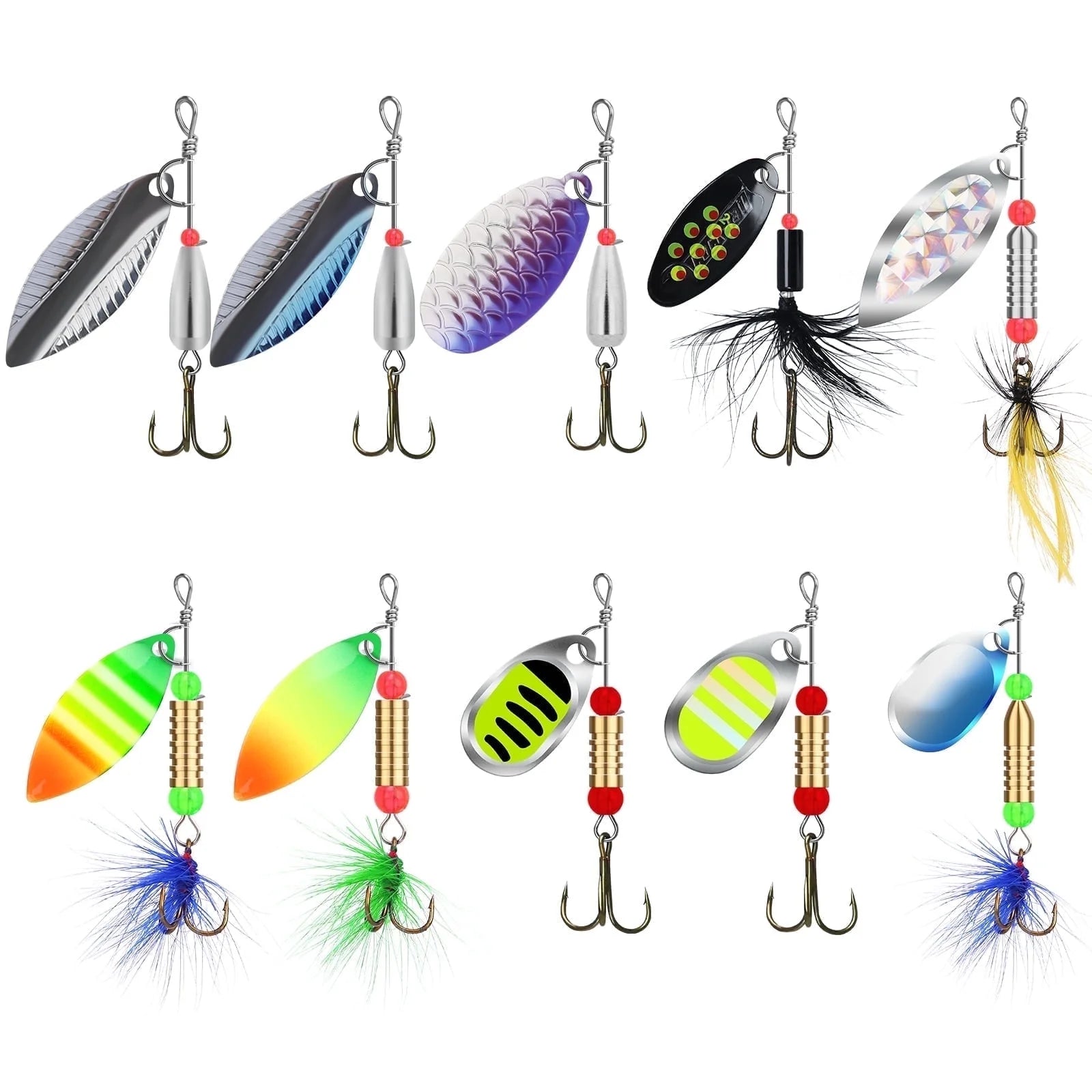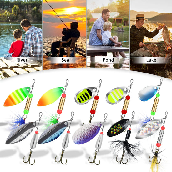 • 🐟SPINNER FISHING LURES SET: This 12pcs spinner bait set contains 2 different sizes of fishing lures (2.2" - 3"). Heavy-weighted body (0.13 - 0.23oz) designed for catching larger fish.