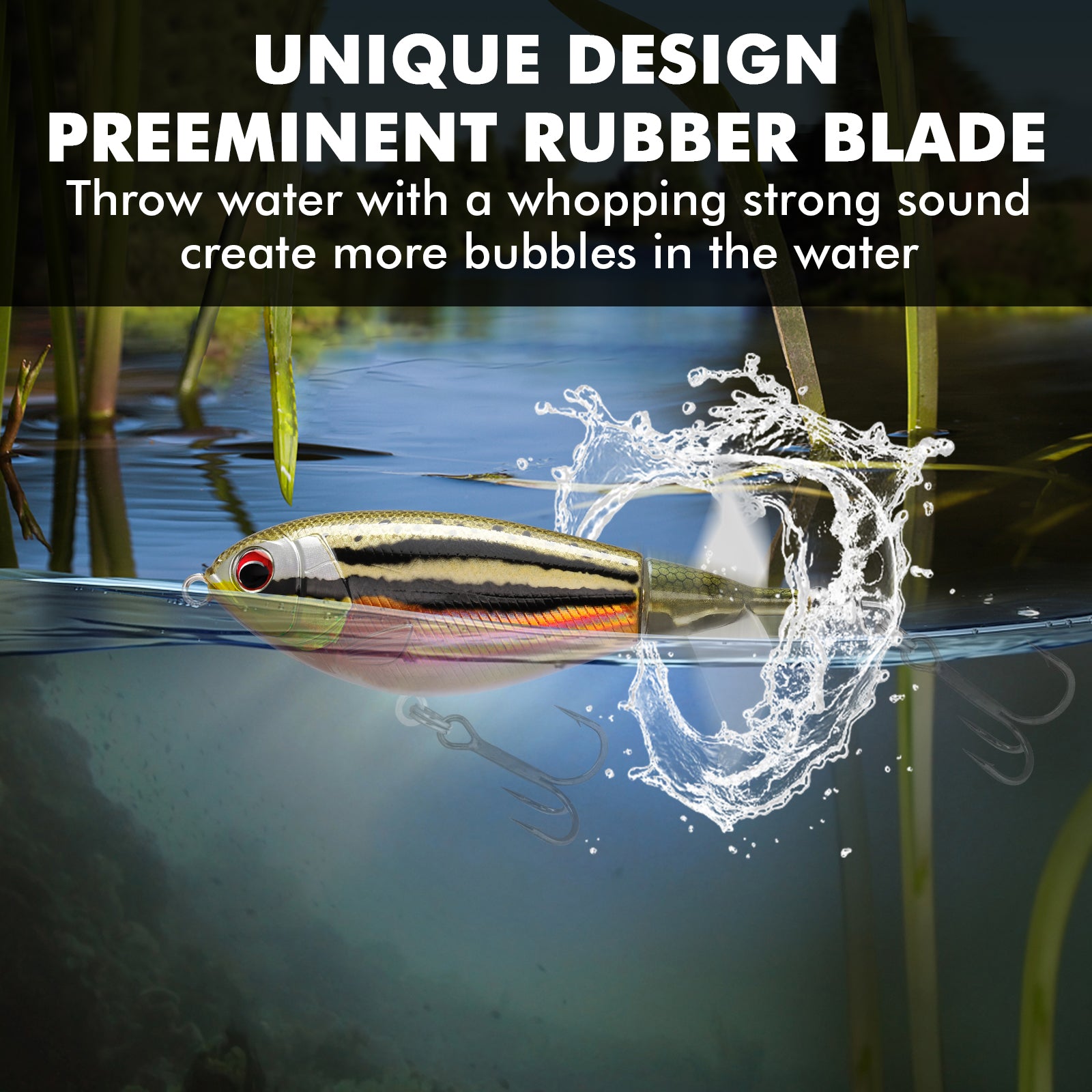 • 🐟Whopper Plopper-Inspired Design: Rotating tail blade creates noise and splashes, perfect for top water bass fishing lures.