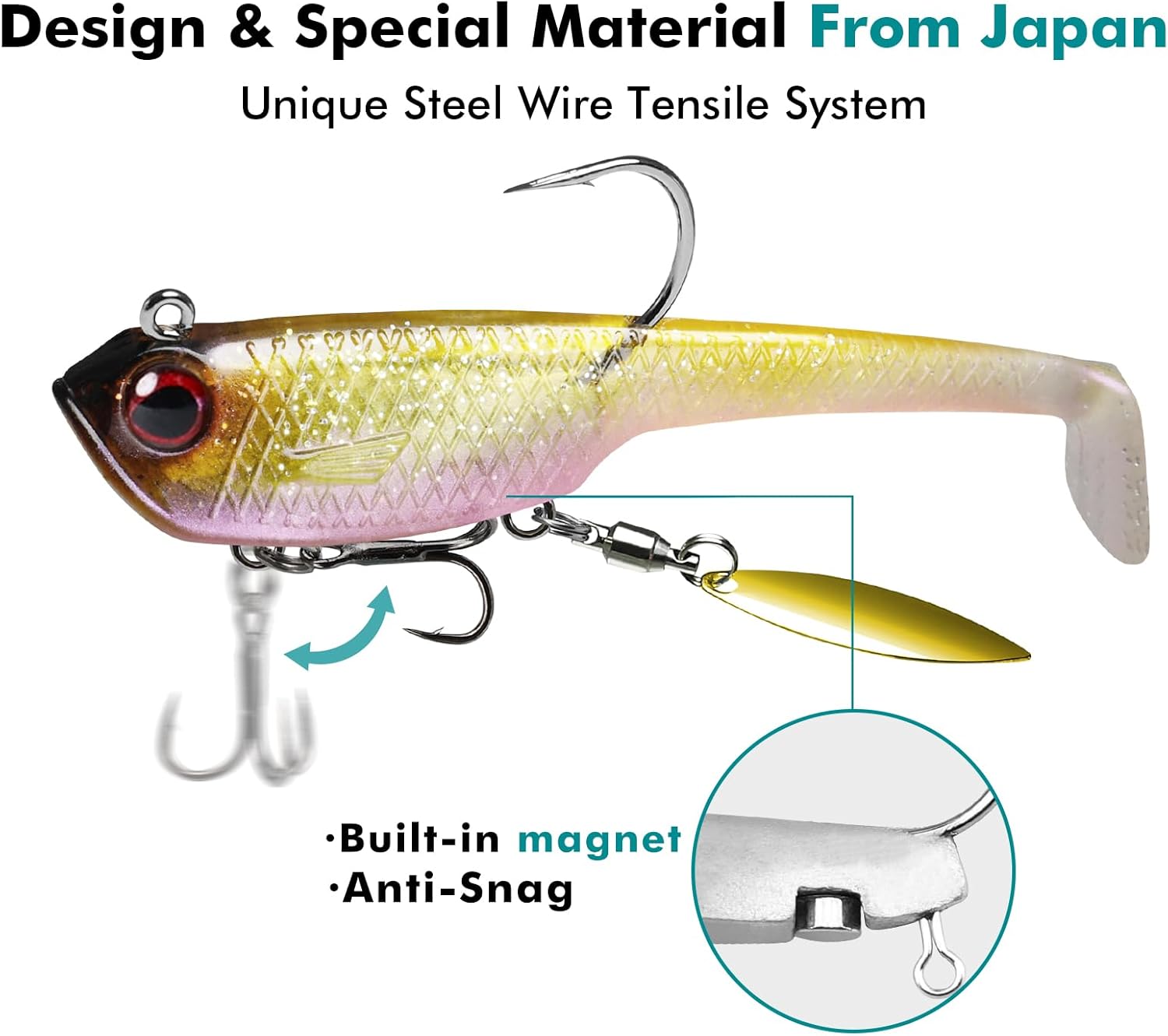 • 🐟UNIQUE DESIGN: Features a 3D T-shaped soft tail with a 360° spinner blade that creates realistic kicking and thumping action, even at slow speeds.