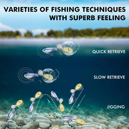• 🐟Rotating Fishing Spinners: Fixed tail tube for smooth action, ideal for bass fishing.