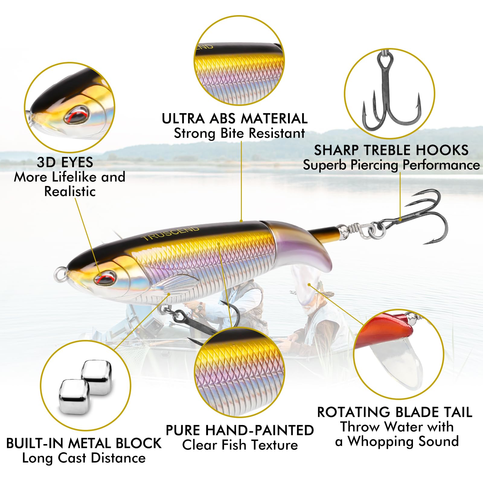 - BLADE UNIQUE DESIGN - TRUSCEND® Fishing Lure Set uses a blade rotating tail design, which delivers a heavy sputter as it moves across the surface, create noise and commotion that fish can not ignore. It also "roll resistant" and works well at a variety of speeds. Interestingly, when the monster bass bites the fishing bait, its tail will close to prevent the bass from spitting it out.