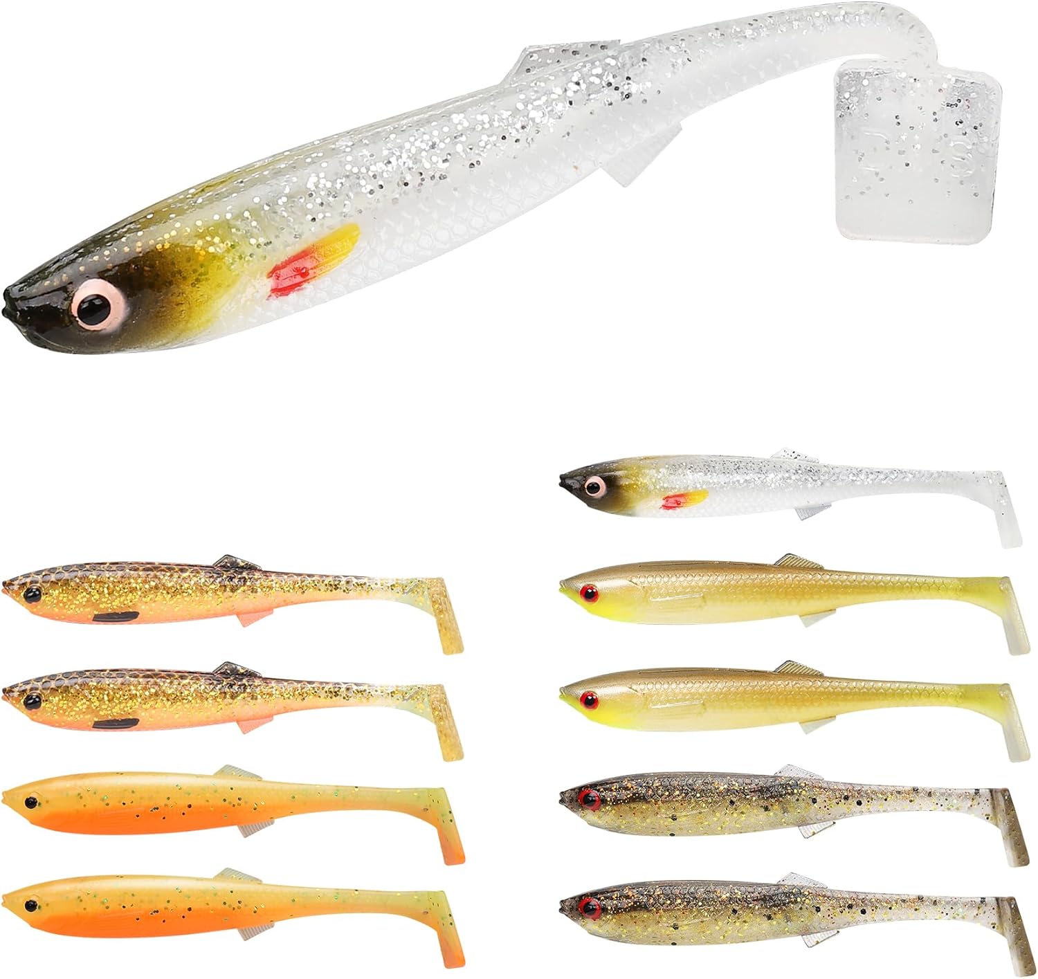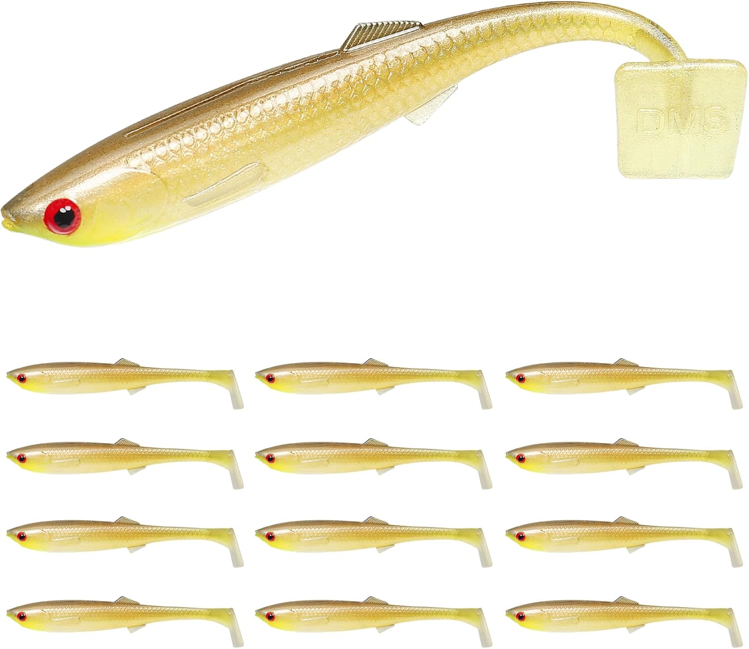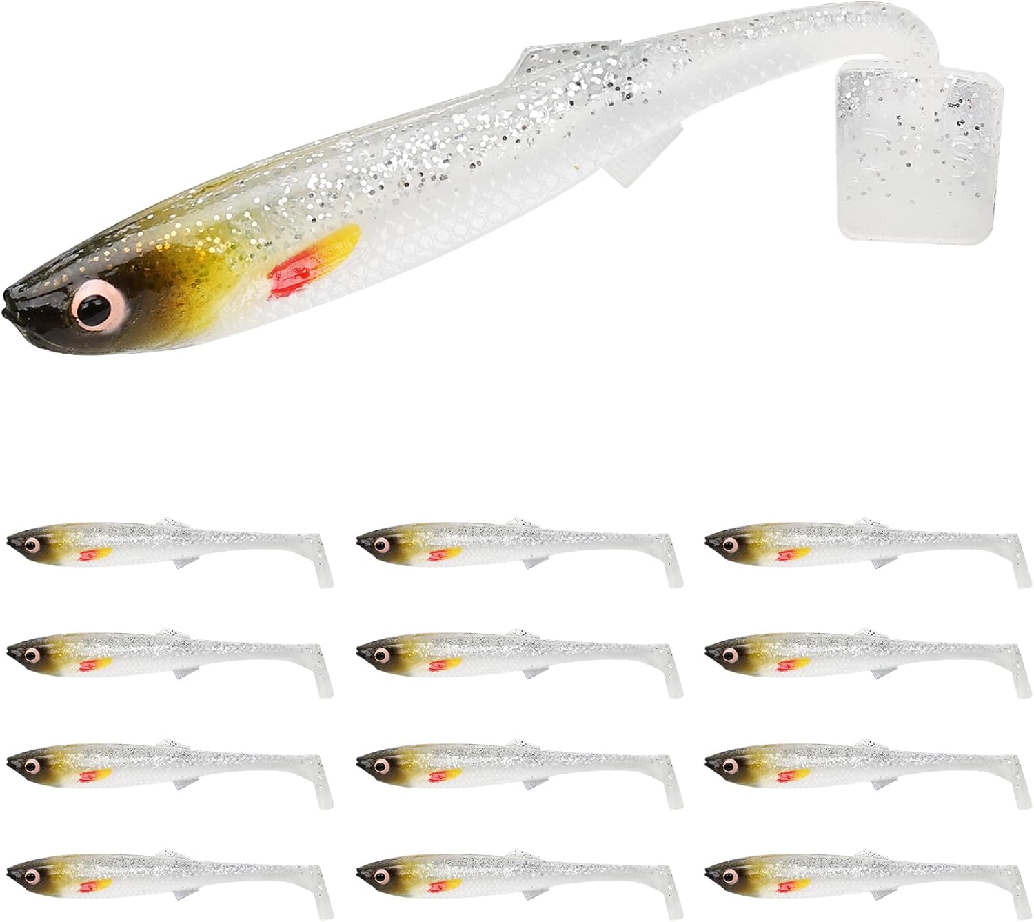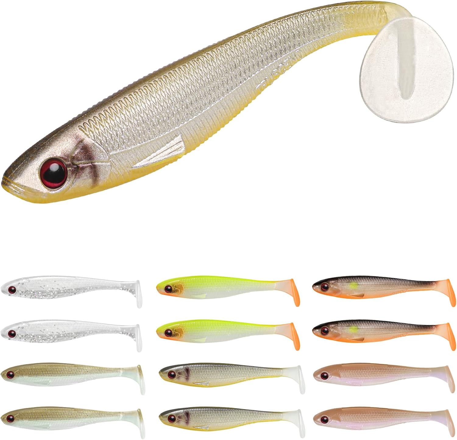 Truscend® Shaking Shad is one of the best selling fishing lures.The swimbaits feature top and bottom hook slots for easier rigging and better hook penetration. Except the 3D paddle tail features, it has  fluorescence effect and long casting jig head design. A must-have soft lure in your box!