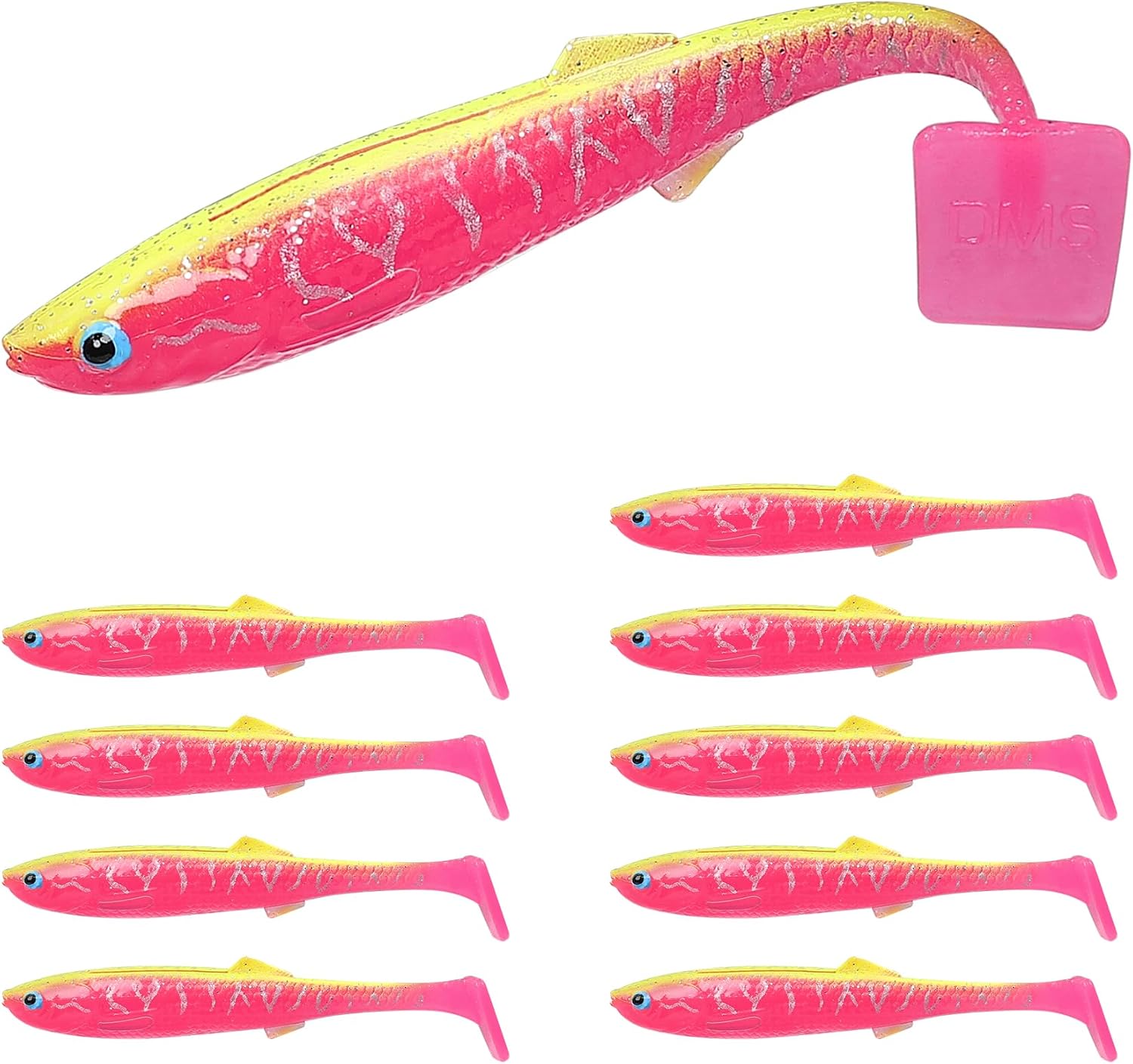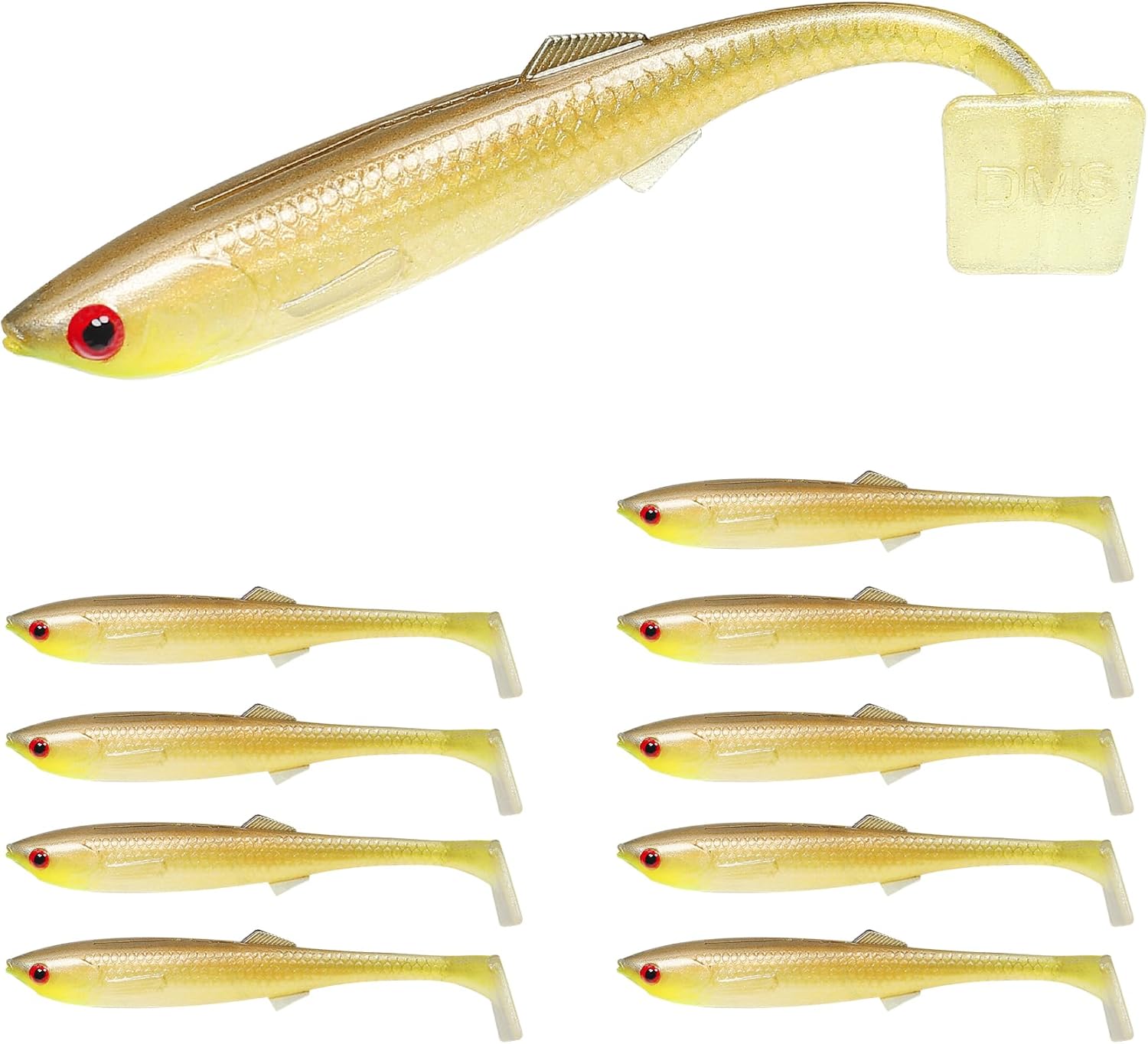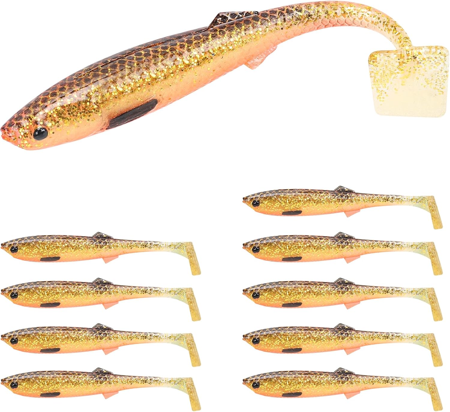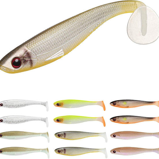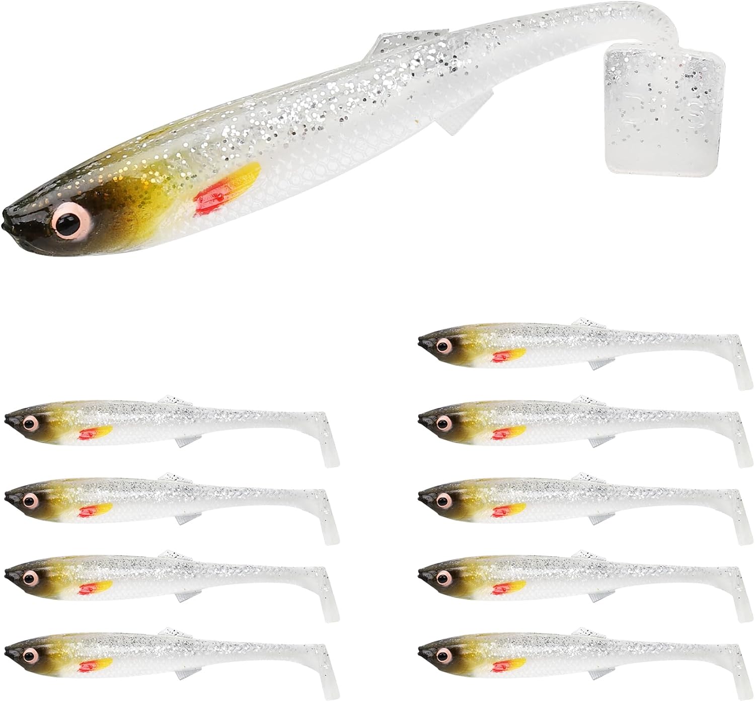 Truscend® Shaking Shad is one of the best selling fishing lures.The swimbaits feature top and bottom hook slots for easier rigging and better hook penetration. Except the 3D paddle tail features, it has  fluorescence effect and long casting jig head design. A must-have soft lure in your box!