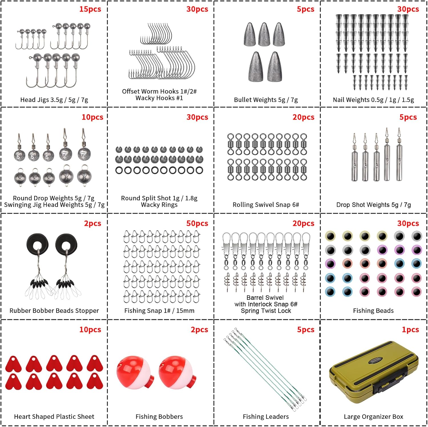 • Kit Contents: 240 pcs, including crankbaits, pencils, poppers, bait-rigs, minnows, VIB, spoons, spinners, paddle tail swimbait, grubs, plastic worms, jig heads, offset hooks, beads, rings, blades, fishing weights, fishing leader, fishing snaps, swivels, and a tackle box.