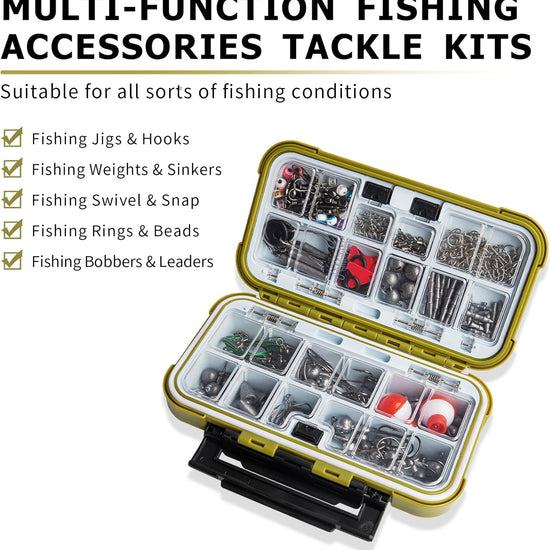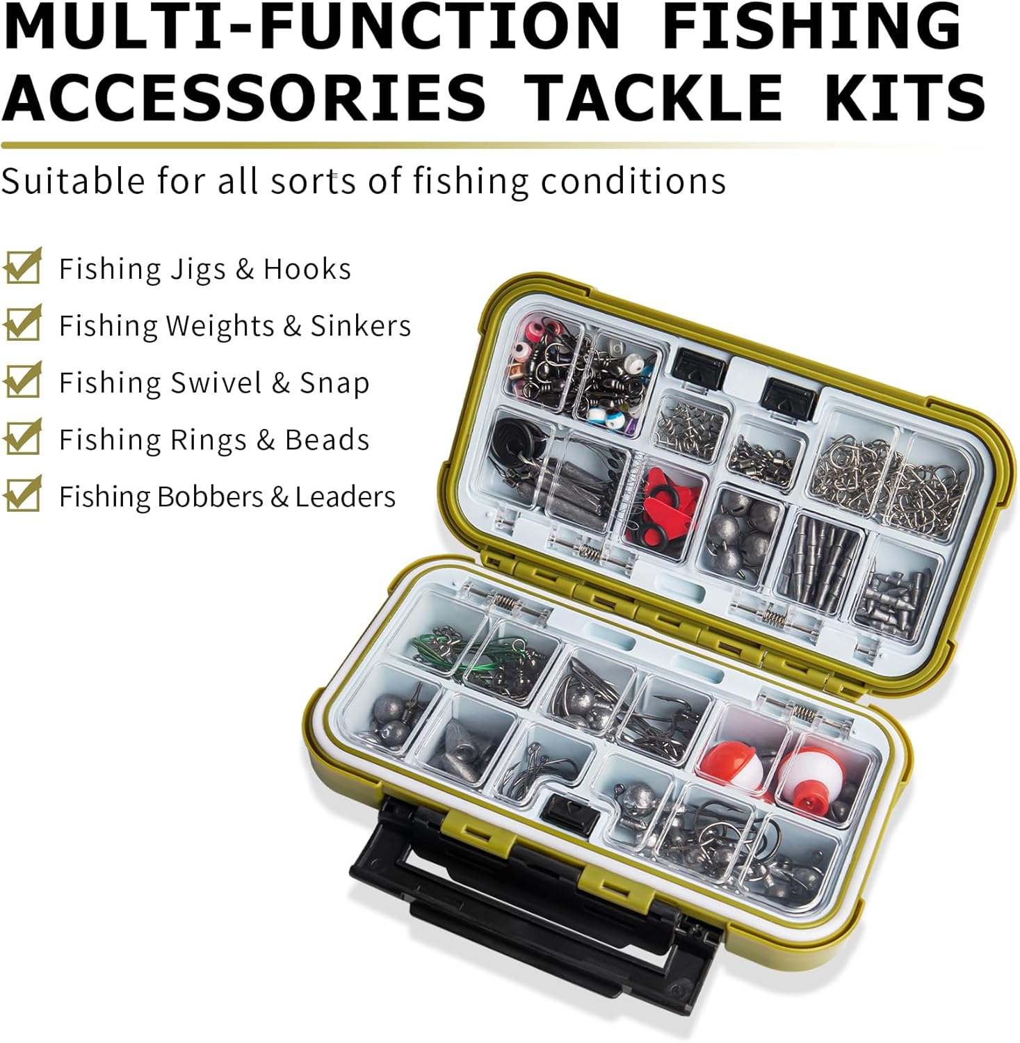 • ❄️🐟Widely Usage Fishing Tackle Set - Excellent easy-to-pack stowaway case for all of your lures and fishing tools. The variety and number of accessories allow you to combine your own fishing rig with confidence. Such as Split Shot Rig, Jig Head Rig, Texas Rig, Carolina rig, Float Rig, Three Way Rig, etc. Unleash your imagination to make different combinations. Complete assortment of fishing accessories kit is suitable for any angler in any season in any water conditions!