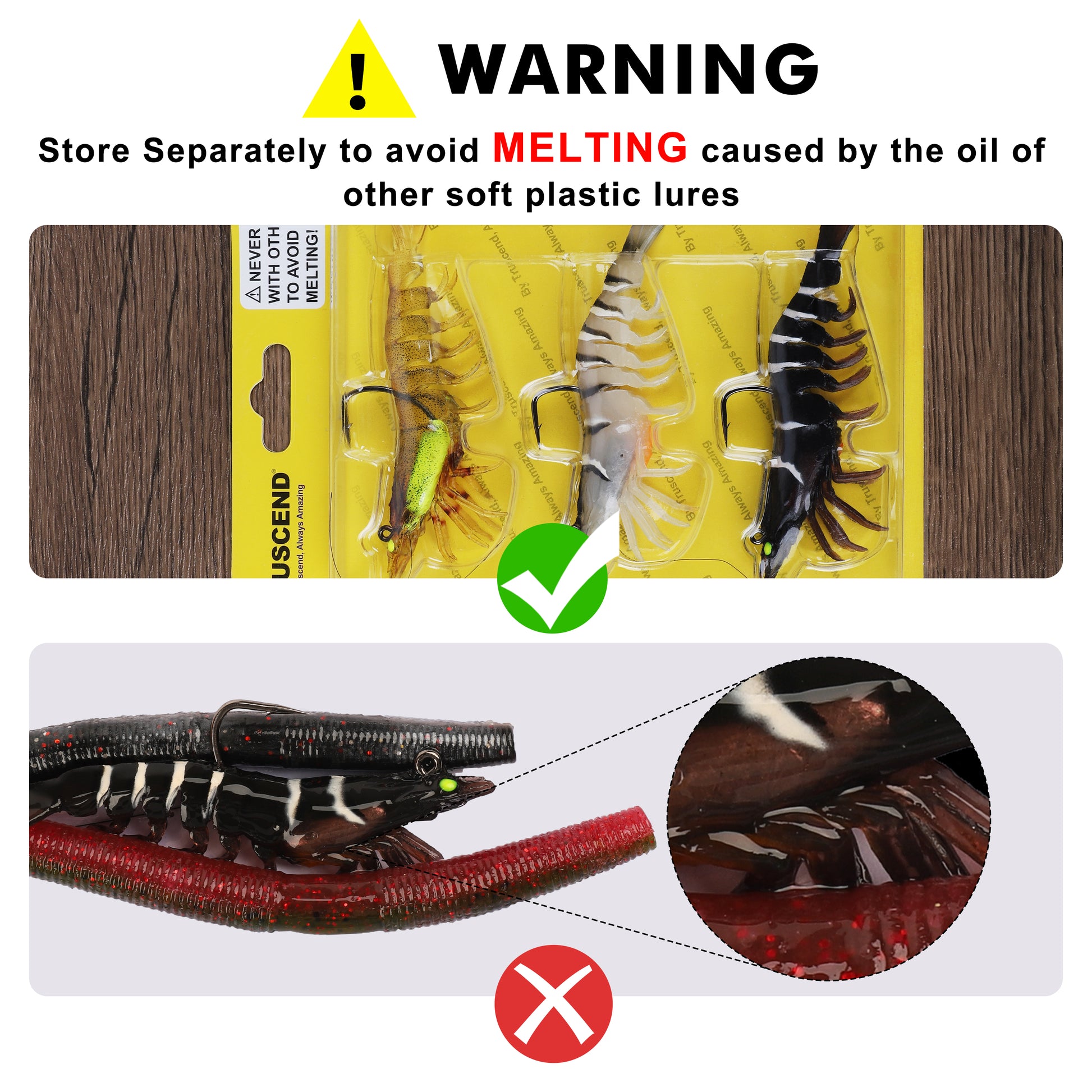 • 🐟Warning: Do not mix any Truscend shrimp lures with other traditional plastics. Store in a separate tray, bag, or box to maintain their integrity.